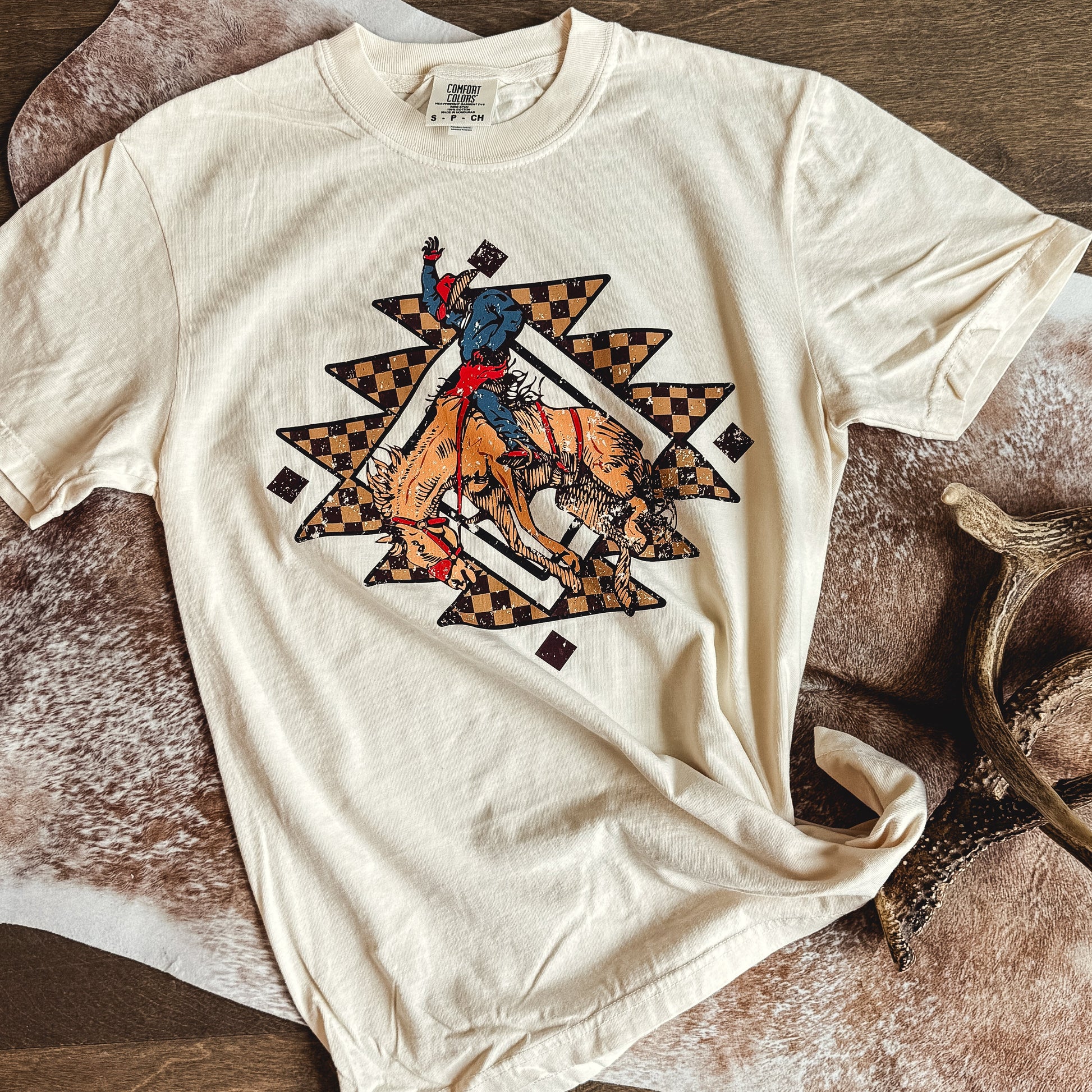 Ride or die in our 'Checker Rodeo Rider' tee. This vintage-inspired graphic features a bronc rider bursting out of a checkerboard frame, printed on a cream Comfort Colors tee. It’s rugged, raw, and ready to wrangle — just like your favorite pair of boots.