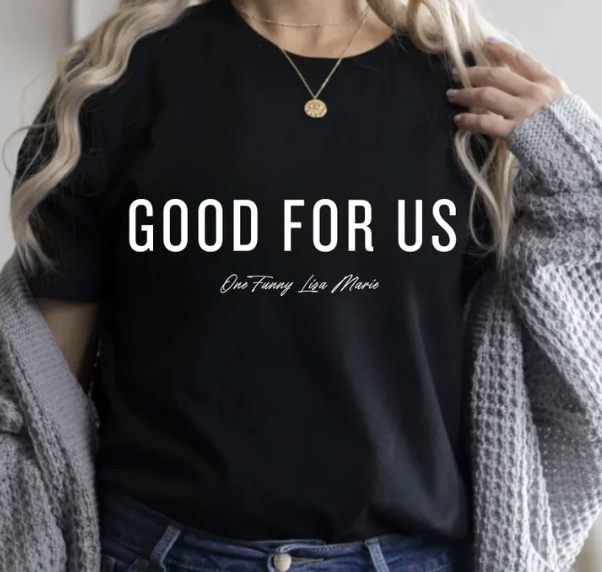 Lisa Marie Exclusive: Add some quirky flair to your wardrobe with Lisa Marie's collection featuring her unique coined phrases for a playful touch. This tee is sure to make you stand out and bring a smile to your face. Go ahead, treat yourself! (It's good for you.) With all of her best - this one is just too good to pass up!