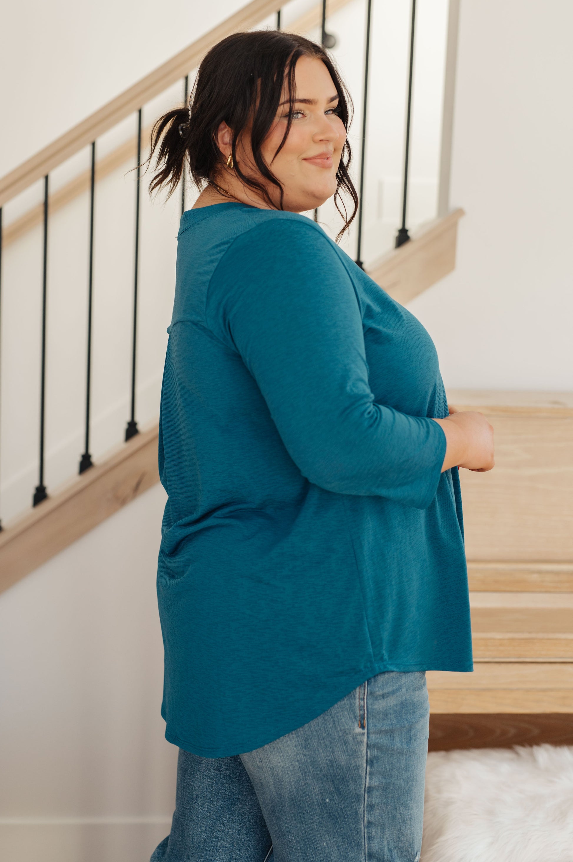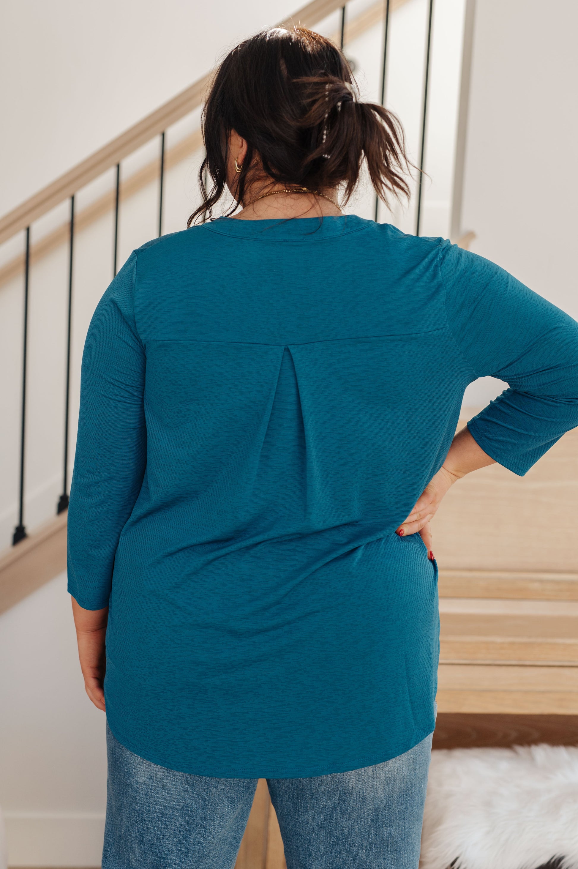 Our So Outstanding Top has a glamorous bulgari knit design featuring a stylish V-neckline, 3/4 length sleeves, and a scoop hem. Perfect for any occasion, you'll turn heads with this statement piece!
